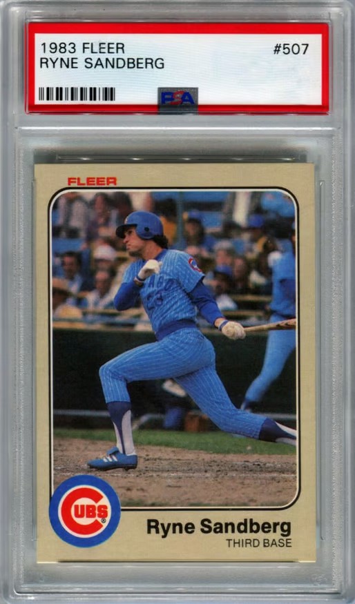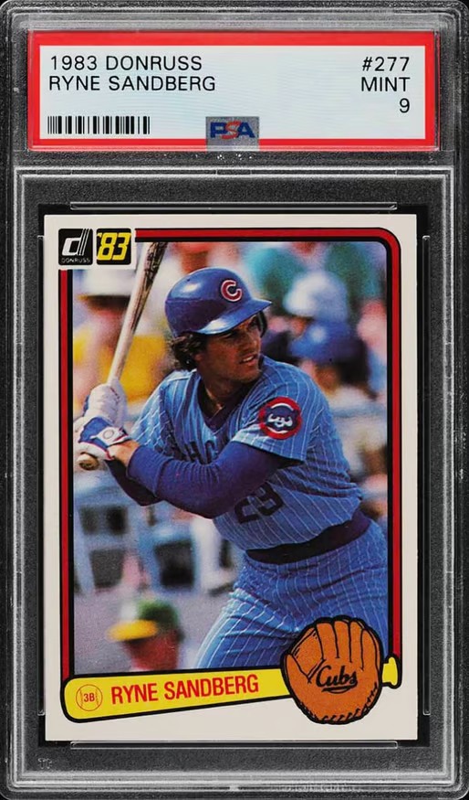 Rounding out the list is the 1983 Fleer Ryne Sandberg rookie card. Fleer cards are recognized for their straightforward design and clear photography, making them a favorite among traditionalists. This card is not only a valuable asset but also an important part of baseball card history, capturing Sandberg in the early days of his illustrious career.